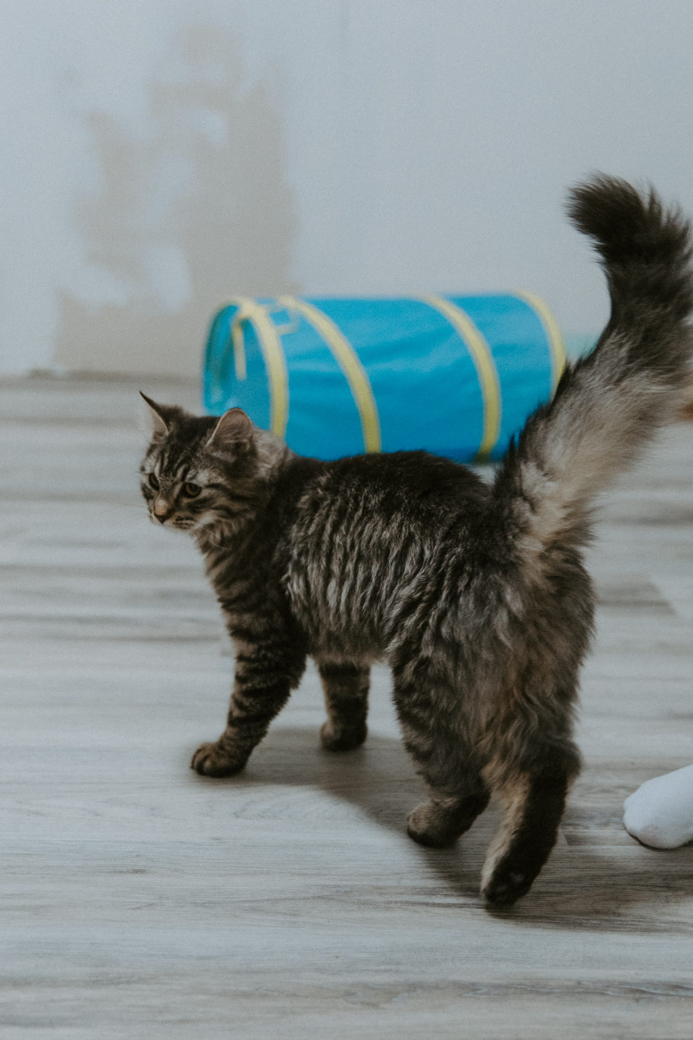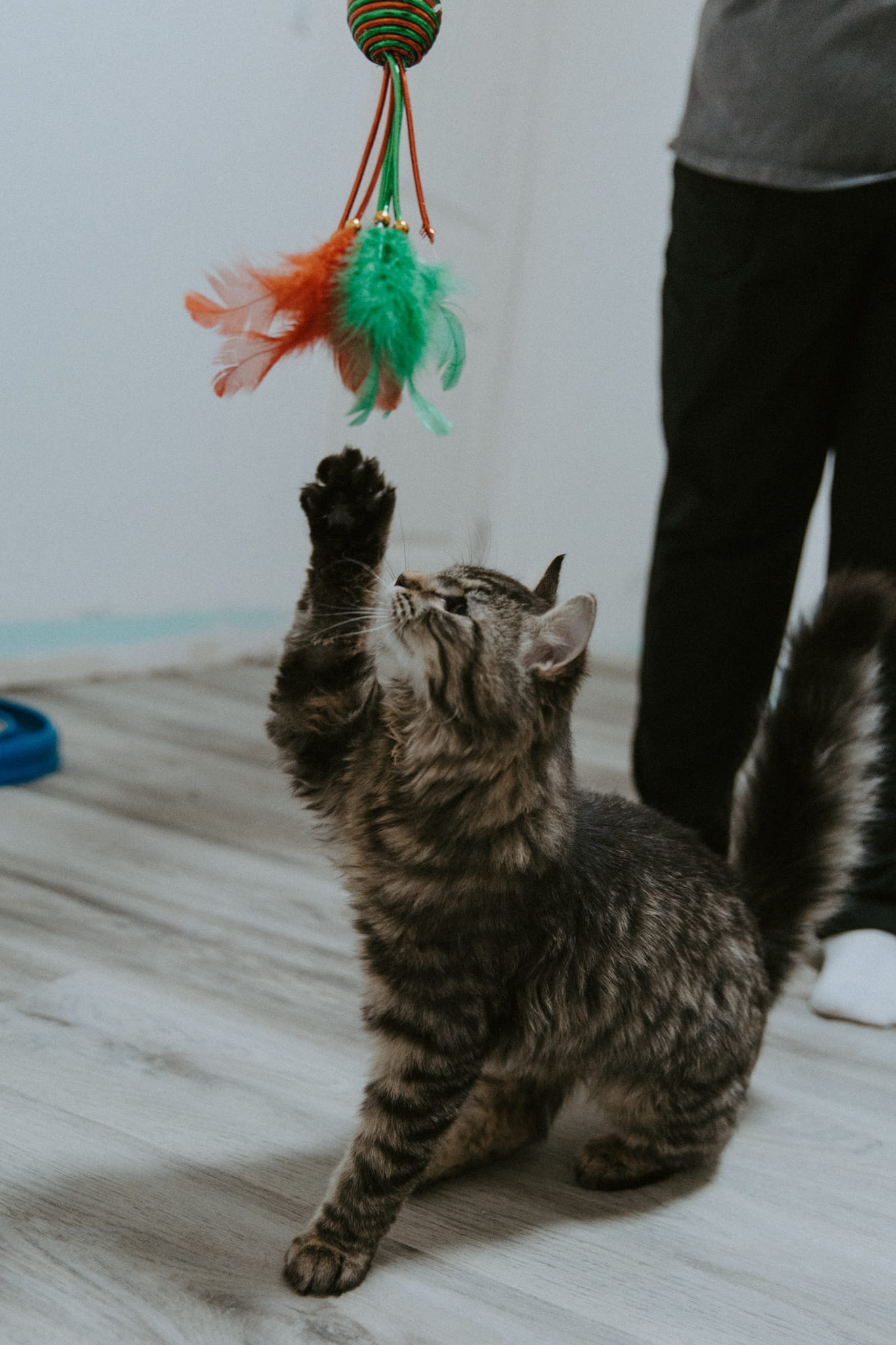 I’m not exactly a lap cat, but I love being near my hoomans and will happily come up for pets when I’m in the mood. I’m a playful, goofy girl who zooms around at the speed of light and then trots back for some affection. Wand toys are my absolute favorite — I could chase them forever!