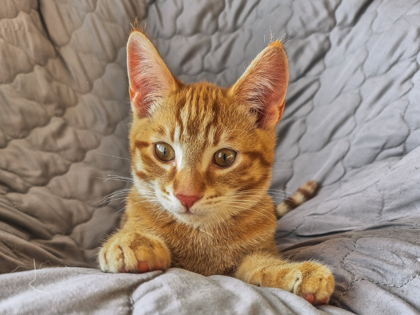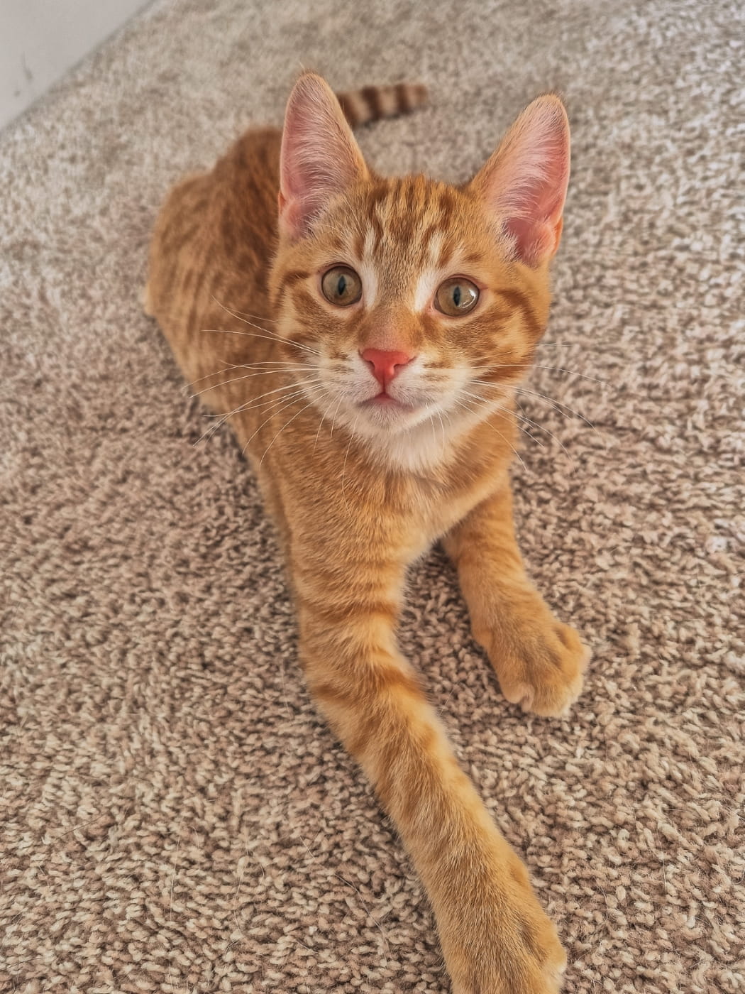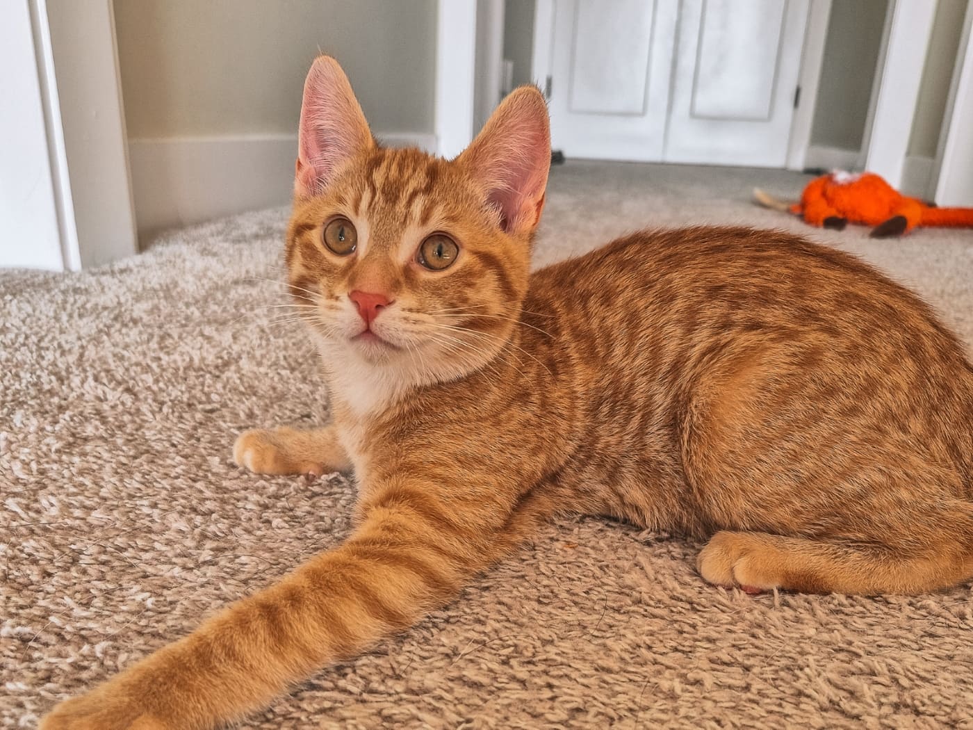 I am one very sweet ginger boy. As a redhead I have a fierce passion to love everyone and everything. I go full on play mode (especially with my sister) but I always come to visit and cuddle when tuckered out. I love crinkle toys and cardboard scratchers. Being picked up and carried like a baby is fun to. All in all I am one great little kitten who will have you laughing nonstop at my antics. I can't wait to find my furever home.