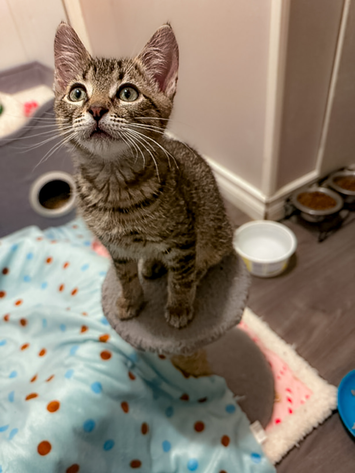 I am fixed, up to date vaccines, microchipped, and dewormed. I need at least one meal of wet food daily for hydration. Wet food is essential for kitties, so please ensure it's included in my diet. Wet food is higher in protein and can be lower in carbs. It also provides added moisture, which is important, as dry-food-only-fed cats tend to be dehydrated, potentially leading to UTIs.