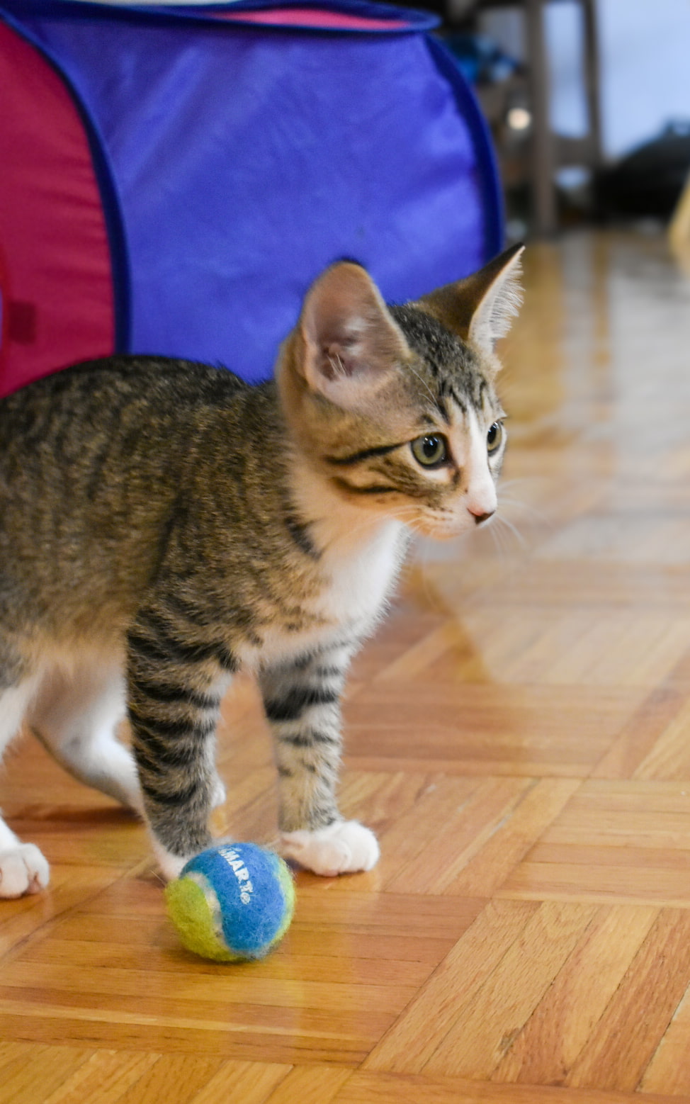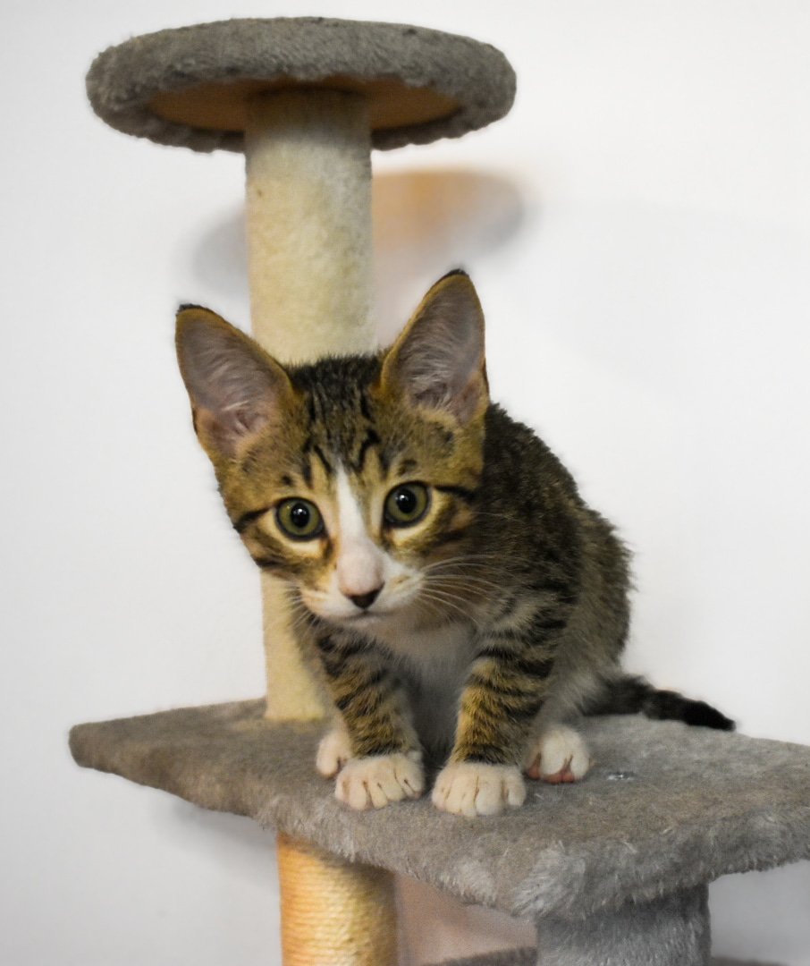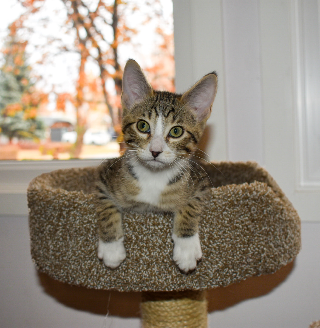 I am one very sweet, very playful kitten who loves to stalk, pounce, and hunt toys. I love to climb up on things and survey my next target. I am very much a tree-dweller type of kitty, so I will need quite a few tall and very sturdy cat trees. Ones that won't topple over when I run and climb up on them. Once tuckered out, I love to come for pets and cuddles. I always need a sleeping buddy, whether it's you or another kitty while you're away. I guess I am pretty social. #sosweetandplayful